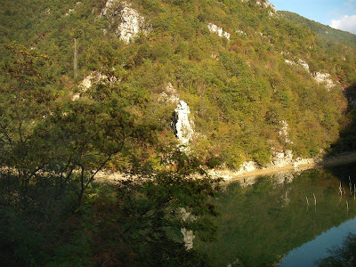 Az út, attól kezdve, ahogy beértünk a hegyek közé, a Vrbas folyó völgyébe, nekem nagyon tetszett. Érthető, az ilyen vidék kedves az én szívemnek, gyorsfolyású vizek, karsztos sziklacsúcsok, zöld-kék-fehér gyönyörűség. Egész úton lélekben Szlovéniában jártam… Az időjárás pompás volt. Sajnos az úton fotózás kedvéért nem álltunk meg /csak visszafelé egyszer/ így hát olyan képeim vannak, amit robogó buszból, ablakon keresztül készítettem. Mellesleg magam is meglepődtem, hogy azért elég tűrhetőek lettek. Igaz, jó néhányat ki kellett selejteznem, de így is maradt elég.